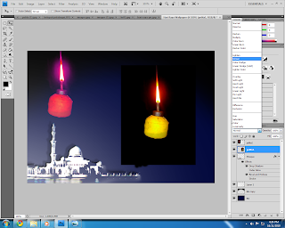 Step 6. Then I take the picture of a 'pelita' on the internet and drag it on the wallpaper. After erasing the unwanted parts, I use the Screen technique again like I did on the mosque (step 2) and duplicate it. After that, I resize it using the free transform (Ctrl + T).
